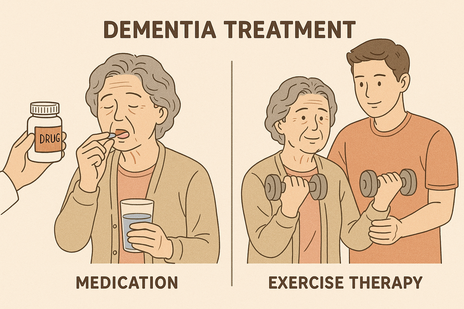 먼저 **약물치료**는 뇌 속 신경전달물질의 불균형을 조절함으로써 치매의 증상을 완화시키려는 접근입니다. 대표적으로 도네페질(Aricept)은 아세틸콜린 분해를 억제하여 기억력 유지에 도움을 주고, 메만틴(Namenda)은 신경독성을 유발하는 글루타메이트의 작용을 조절해 신경세포를 보호합니다. 이러한 약물은 인지기능의 저하 속도를 늦추고, 일상생활 수행 능력을 향상하는 데 일정 부분 기여할 수 있습니다. 그러나 약물치료는 근본적인 치료가 아닌 ‘증상 완화’에 초점이 맞춰져 있으며, 효과는 대개 질환의 초기 또는 중기 단계에서만 뚜렷하게 나타납니다. 또한 위장 장애, 어지럼증, 불면, 식욕 부진 등 다양한 부작용이 발생할 수 있으며, 약물 효과에 대한 개인차도 큽니다. 일부 환자는 오히려 부작용 때문에 약물 복용을 중단해야 하는 상황에 놓이기도 합니다. 반면 **운동요법**은 신체활동을 통해 뇌 기능을 자극하고 개선하는 접근입니다. 대표적인 운동으로는 빠르게 걷기, 자전거 타기, 수영, 요가, 스트레칭 등이 있으며, 하루 30분 이상, 주 3~5회 정도의 꾸준한 실천이 권장됩니다. 운동은 뇌혈류 개선뿐만 아니라 스트레스 완화, 수면 질 향상, 우울증 완화 등 여러 측면에서 치매 환자에게 긍정적인 영향을 줍니다. 또한 최근 연구에 따르면 규칙적인 유산소 운동은 뇌의 해마 크기를 증가시키고, BDNF(뇌유래 신경영양인자)를 통해 시냅스 가소성을 향상해 기억력 유지에 실질적인 기여를 할 수 있습니다. 이는 단순히 보조요법이 아니라, 뇌의 구조적 변화까지 유도할 수 있는 강력한 비약물적 개입임을 의미합니다. 물론 운동 역시 모든 환자에게 적용하기 어려울 수 있습니다. 운동을 지속할 수 없는 신체 조건이나, 인지기능 저하로 인해 활동 계획을 세우는 데 어려움을 겪는 환자에게는 실천이 쉽지 않기 때문입니다. 또한 운동의 효과는 비교적 장기적인 시간과 노력이 필요하며, 단기간에 뚜렷한 변화가 나타나지 않는다는 점에서 조급함을 느끼는 환자에게는 비효율적으로 느껴질 수도 있습니다. 종합적으로 볼 때, 약물치료는 초기 대응에 유리하고 단기적인 효과가 빠른 반면, 운동요법은 장기적이고 구조적인 변화를 유도하는 장점이 있습니다. 따라서 두 방법은 상호보완적으로 병행할 때 가장 높은 효과를 기대할 수 있습니다.
