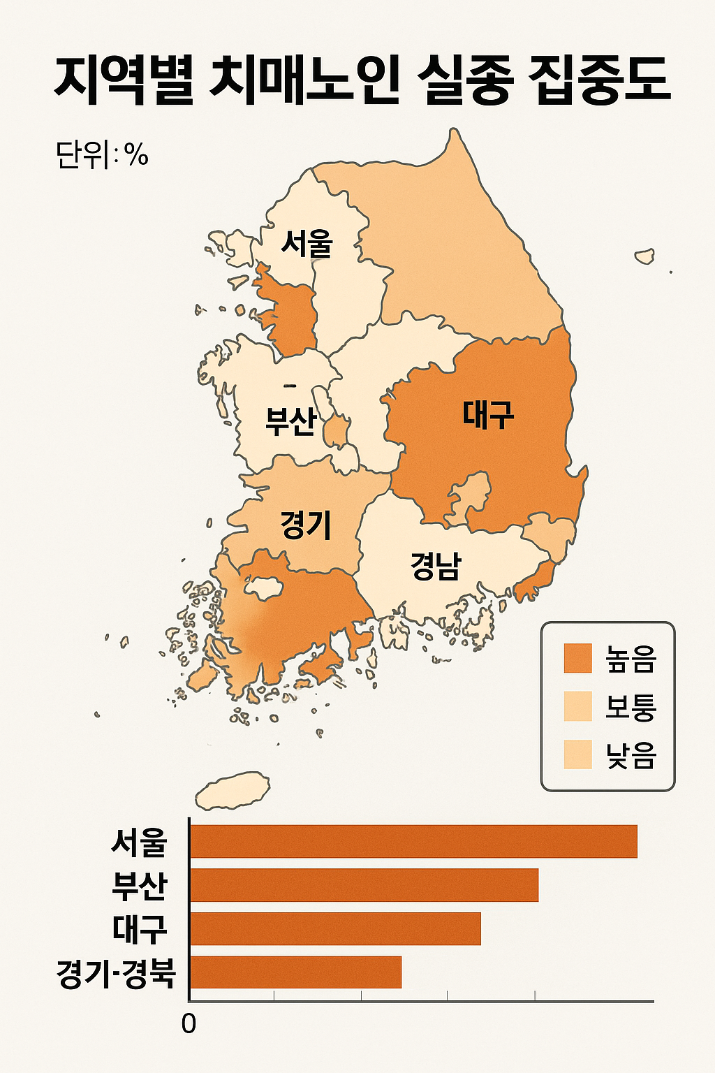 첫째, 고령화 수준과 인구 구조다. 서울과 같은 대도시는 인구가 많지만, 전체 인구 중 고령자의 비율은 오히려 지방보다 낮다. 반면, 경북, 전남, 강원 등의 농촌 지역은 전체 인구 중 65세 이상 고령자의 비율이 20~30%를 넘는 경우가 흔하다. 자연히 치매 유병률도 높고, 실종 가능성 또한 증가한다.